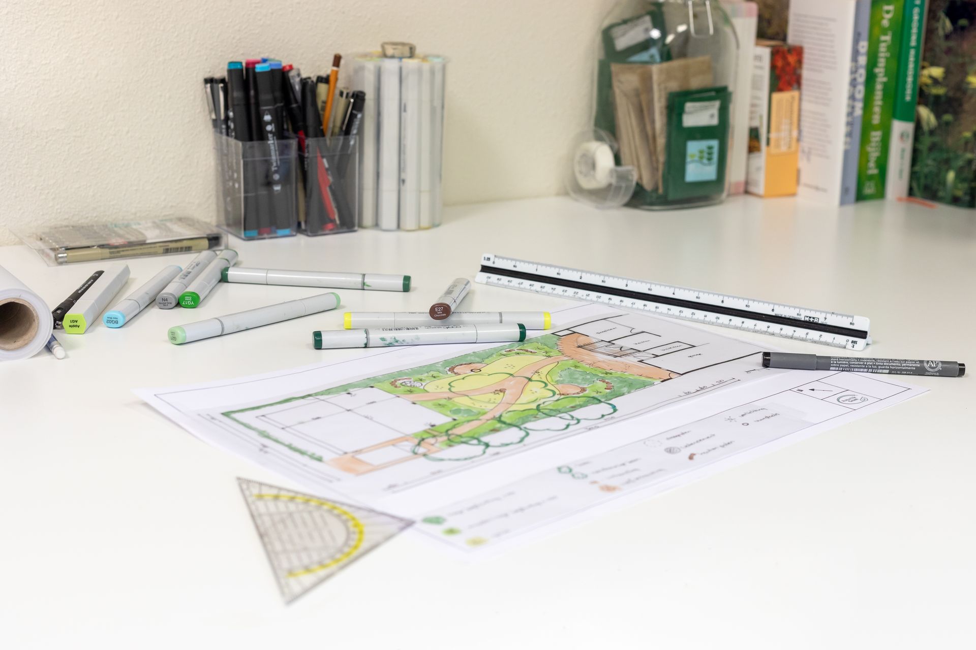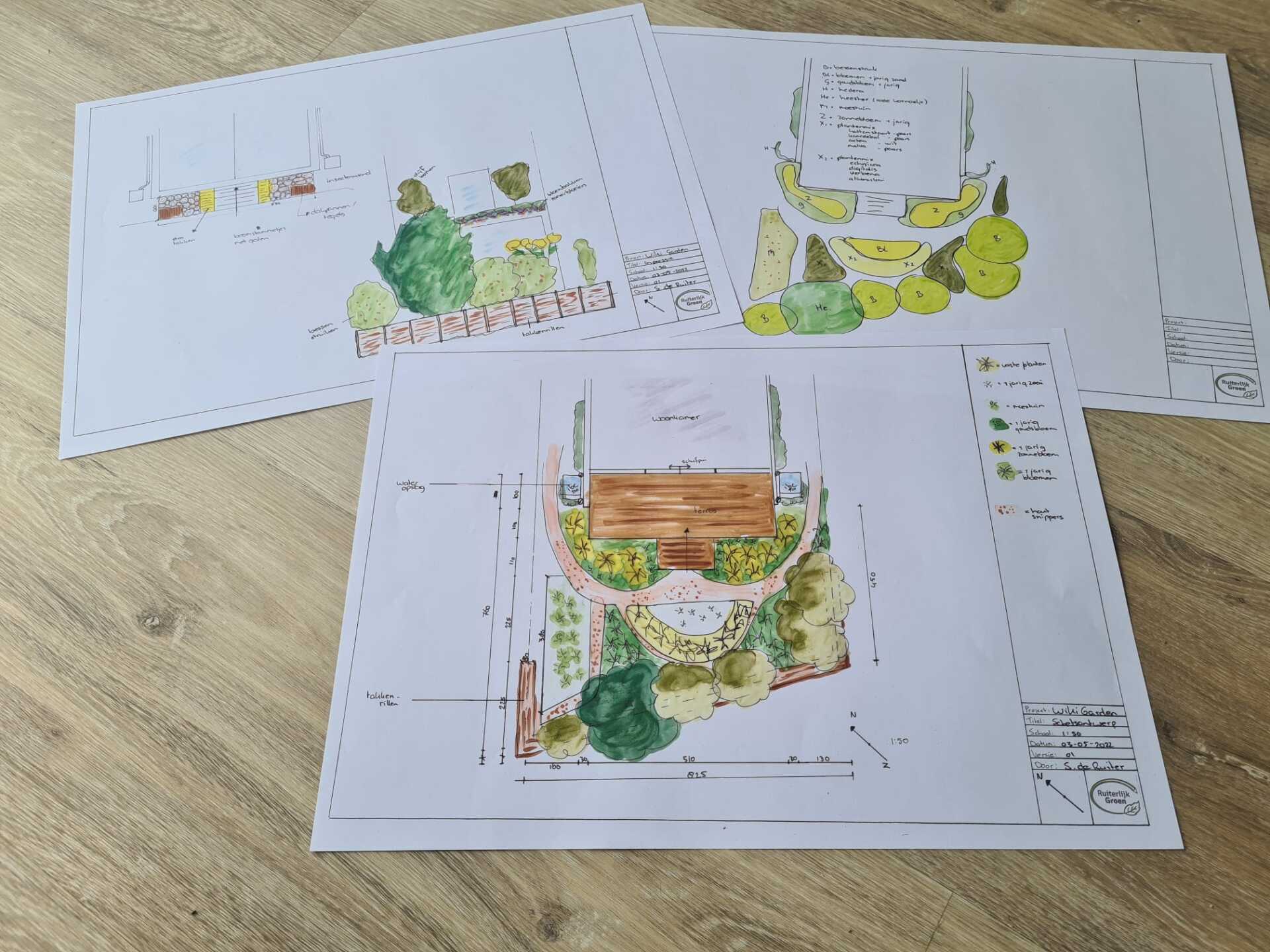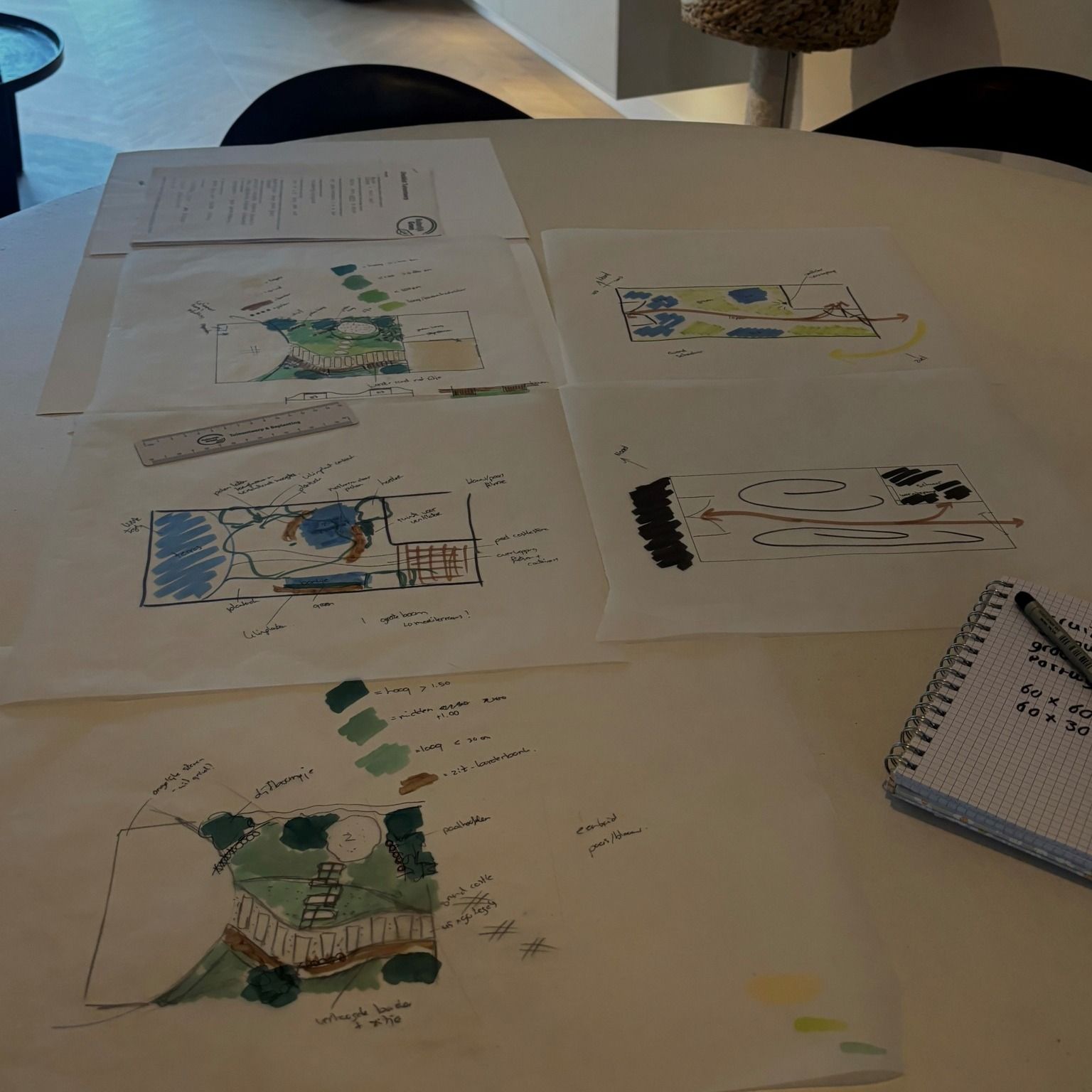 Samen met de klant schetsen uitwerken voor het eerste concept. Geen rechte lijnen, veel kleur, veel groen en genoeg bloemen en planten voor vlinders en vogels.
