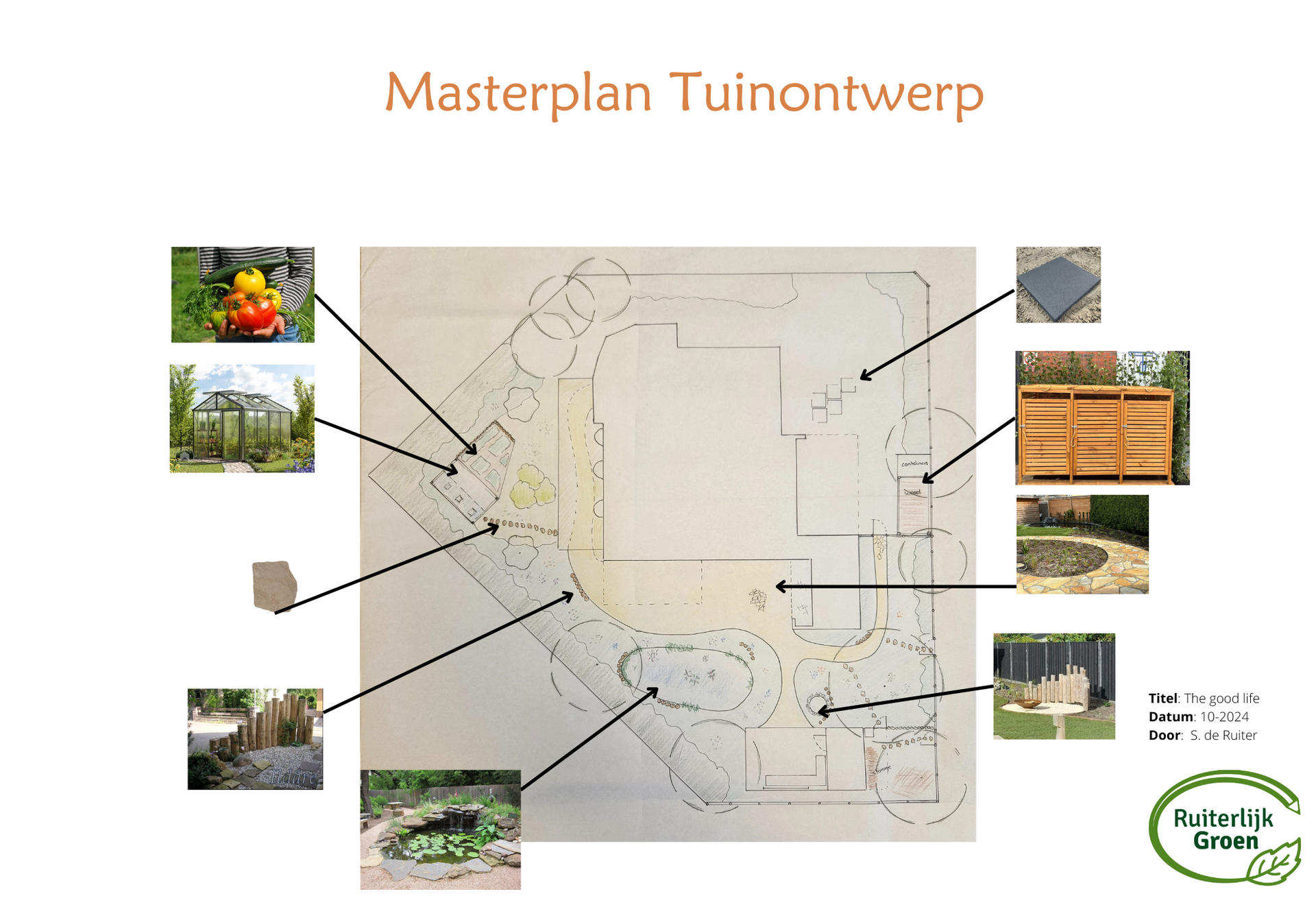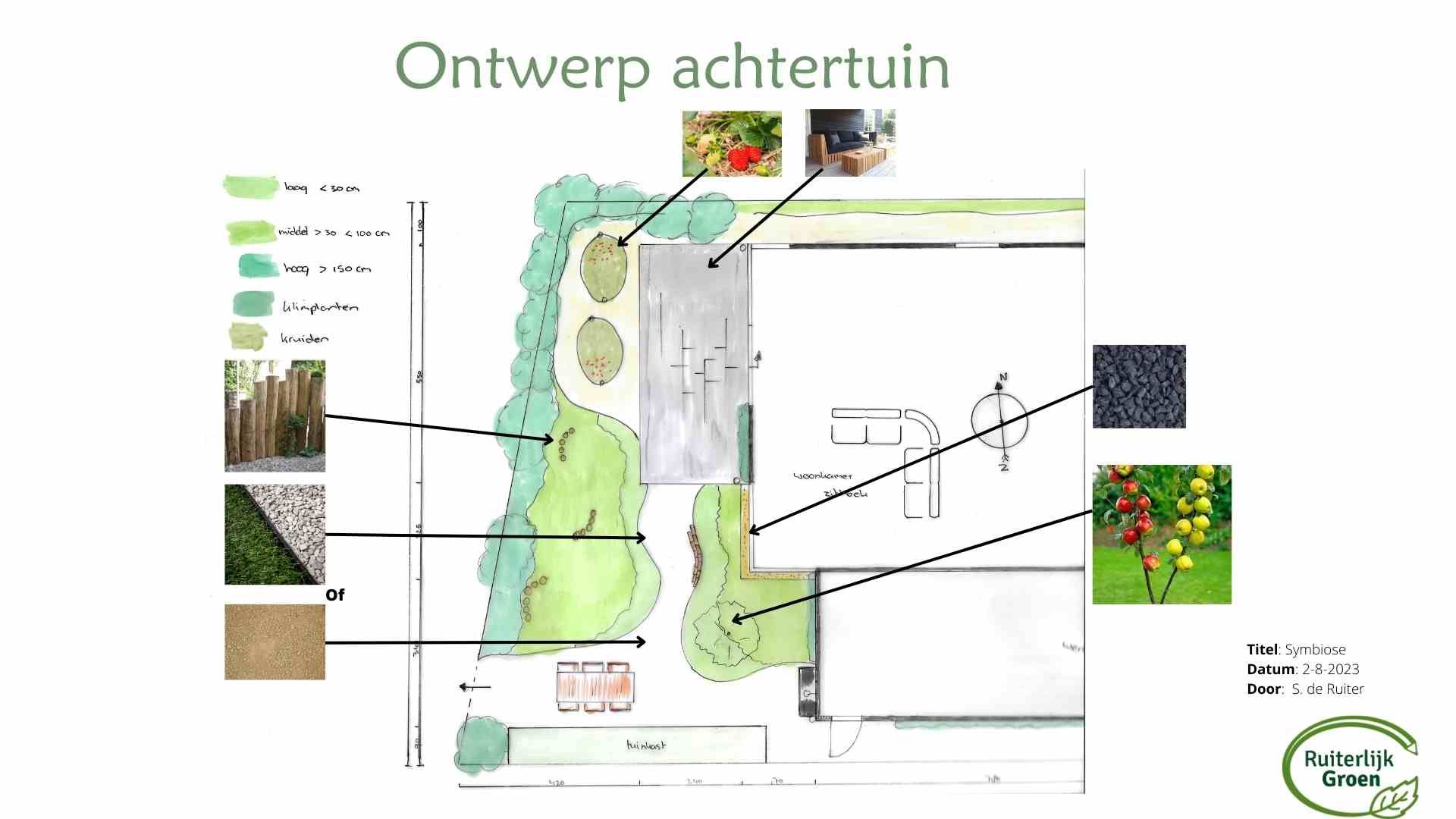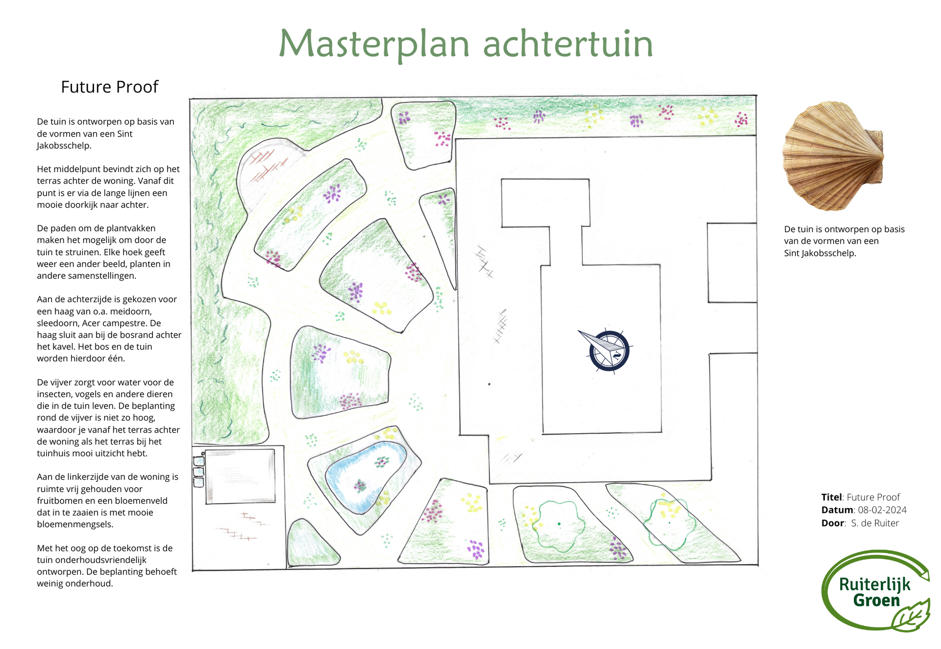 Samen met de klant schetsen uitwerken voor het eerste concept. Geen rechte lijnen, veel kleur, veel groen en genoeg bloemen en planten voor vlinders en vogels.