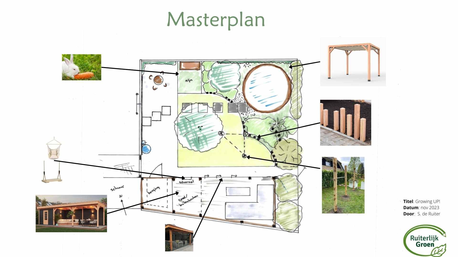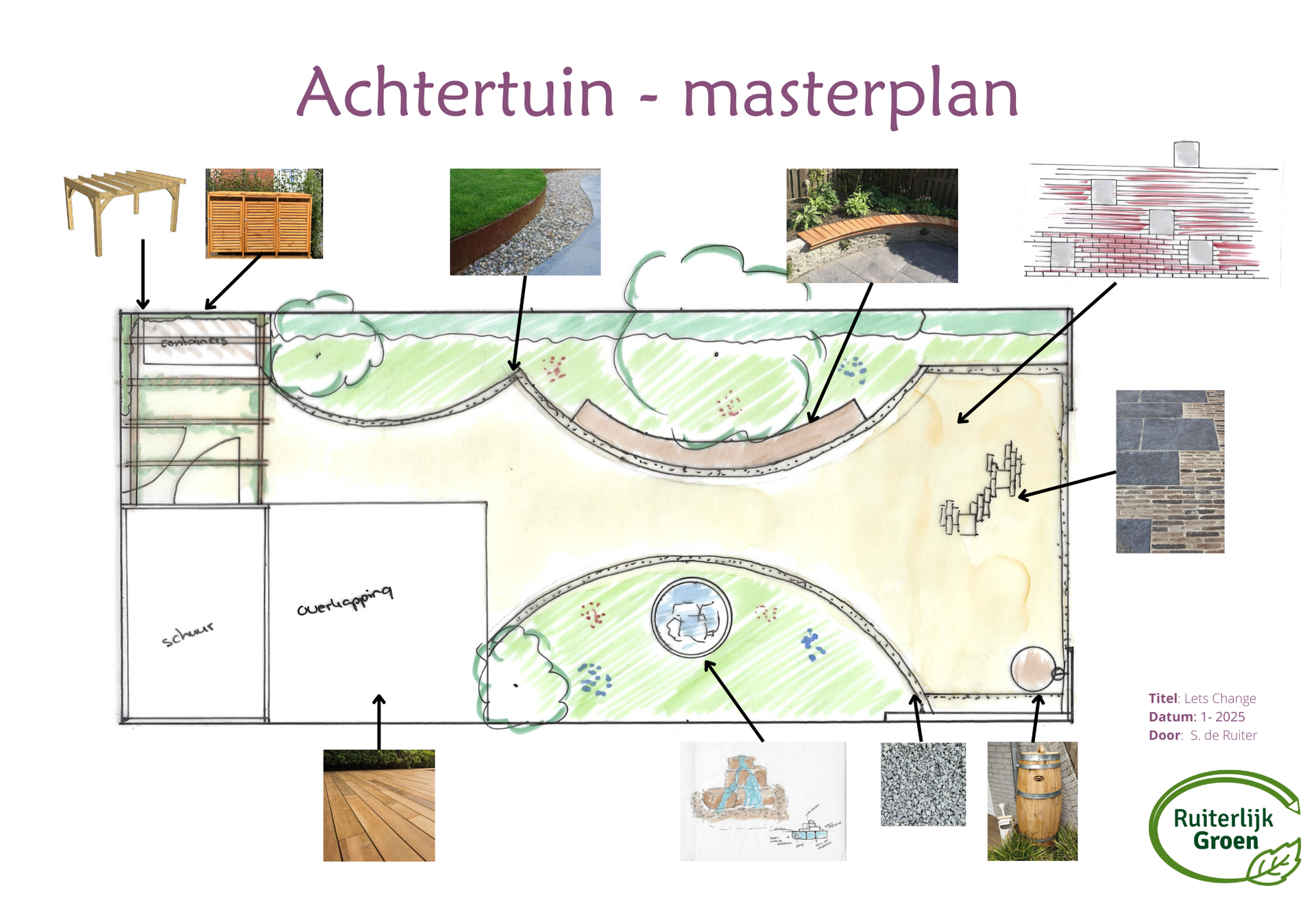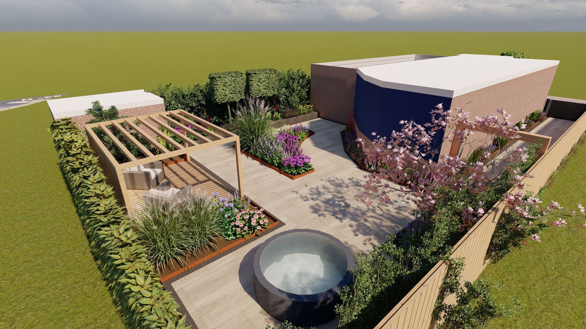 Een compleet betegelde tuin omgetoverd tot een lichte, ruime, groene omgeving waar in de zomer voor ieder iets wils is te vinden. De pergola wordt bedekt door klimplanten, genoeg ruimte om te kunnen lopen, spelen, rennen. Plaats voor een groot zwembad en als de kinderen groot zijn kan daar alsnog een compleet plantvak gerealiseerd worden.