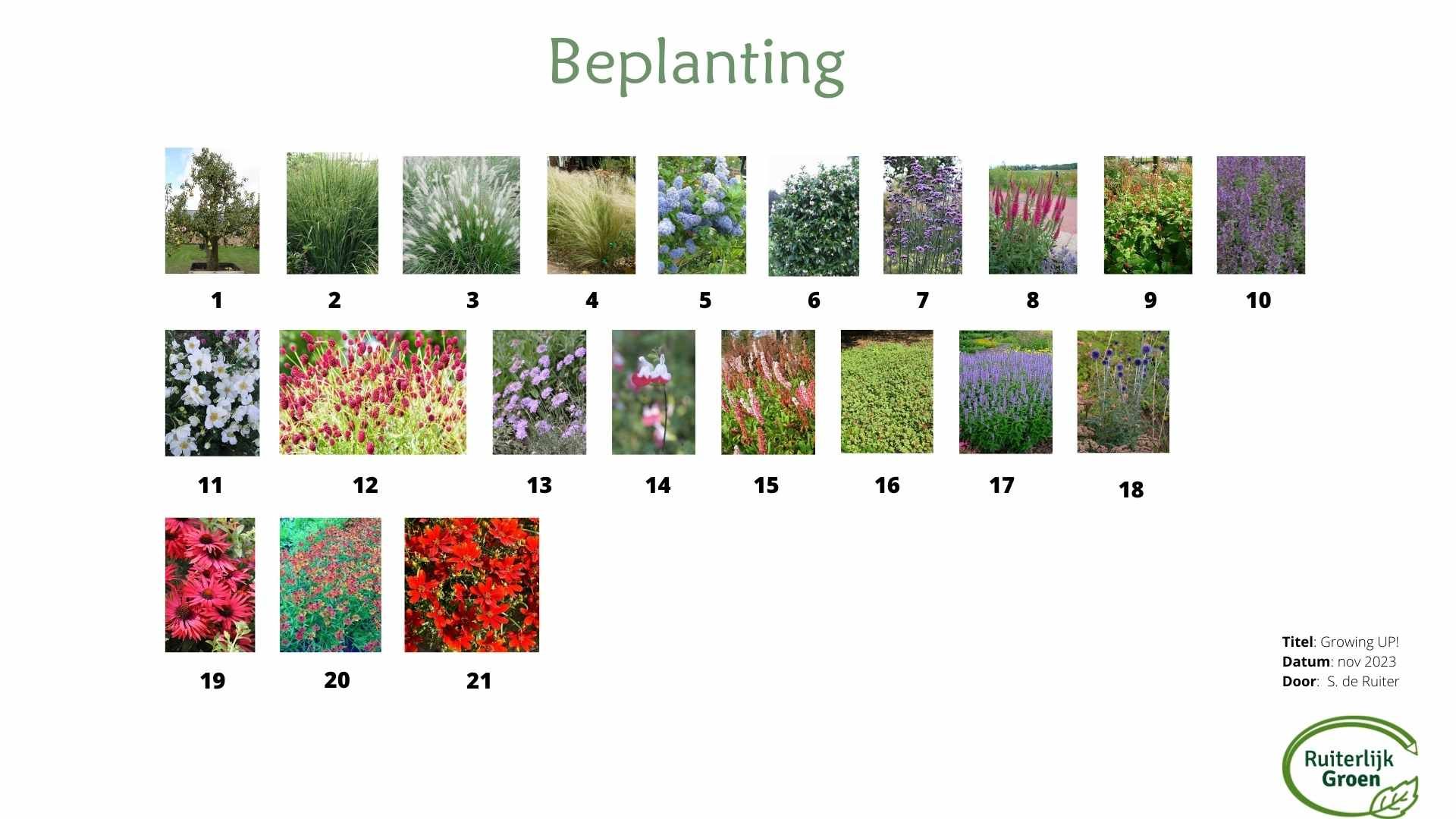 Grote tuin in de nieuwbouwwijk Nobelhorst. Een tuin met ruimte voor de ouders om lekker te relacen en speelruimte voor de kinderen. Een grote oude fruitboom als eyecatcher, veel bloei van april tot november. Afwisselend groenblijvend en bladverliezend.